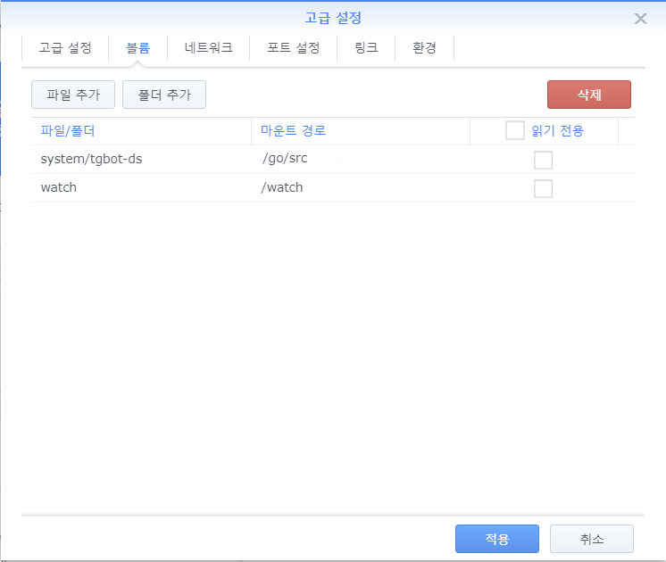 - 컨테이너가 폴더 접근을 할 수 있도록 볼륨을 설정합니다.