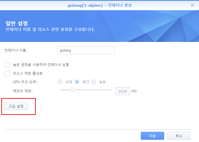 - 컨테이너 생성 화면에서 [고급 설정] 버튼을 누릅니다.