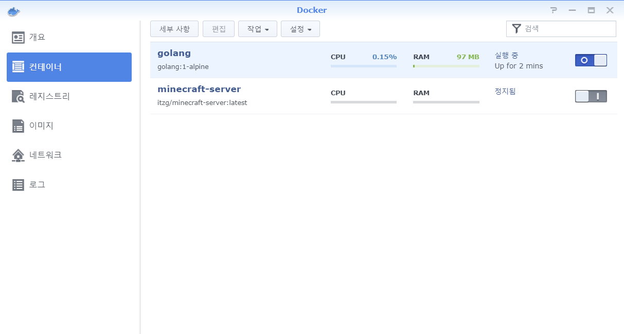- Docker > 컨테이너 메뉴에서 생성한 Golang을 실행해주고, [세부사항] 버튼을 눌러 창을 엽니다.