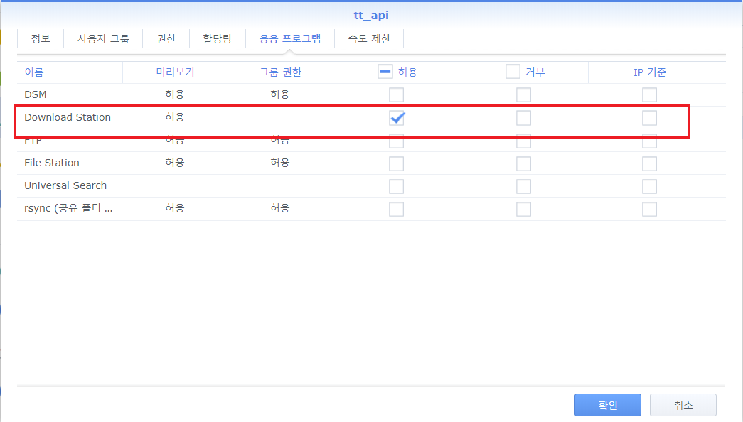 - Synology API에서 연동할 수 있도록 Download Station 응용프로그램 허용 권한을 줍니다.
