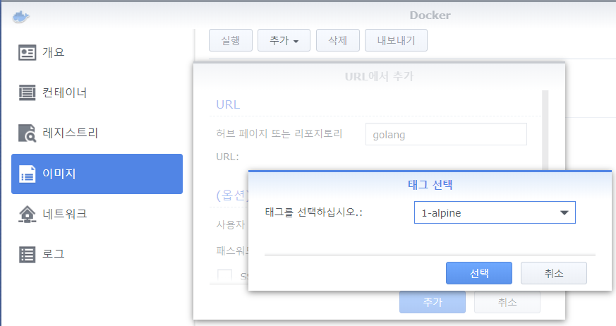 - Docker를 열어서 '이미지' 메뉴 > [추가] 버튼 > URL에서 추가 > 'golang' 입력 > '1-alpine' 태그 선택을 합니다.