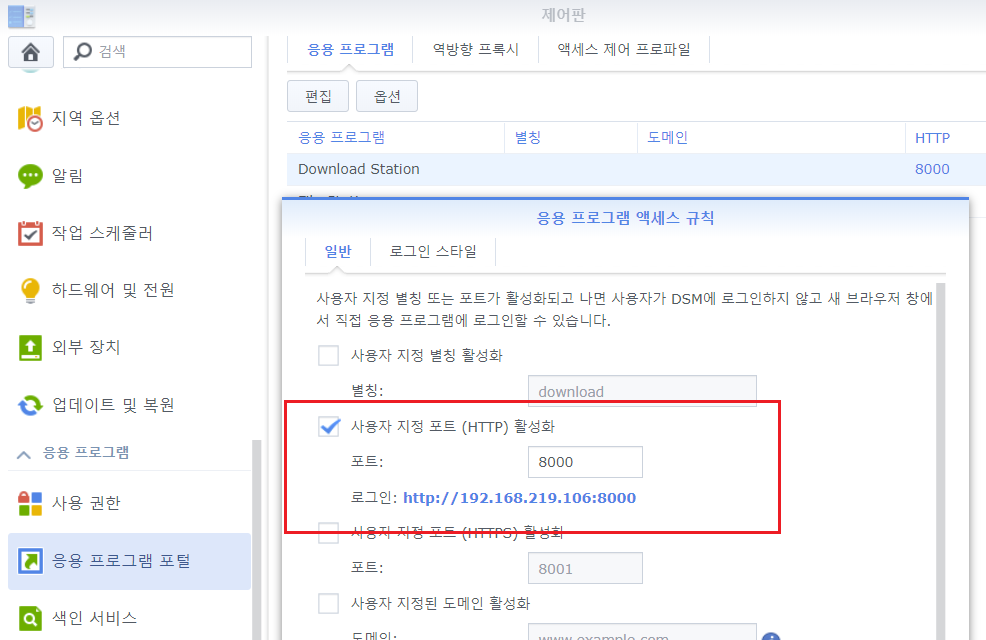 - 제어판 > 응용 프로그램 포털에서 'Download Station'을 선택하고 [편집] 버튼을 눌러 사용자 지정 포트를 활성화합니다.