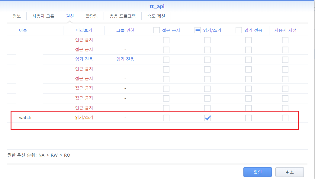 - 'tt_api'라는 계정을 만들고 watch 폴더의 읽고/쓰기 권한을 줍니다.